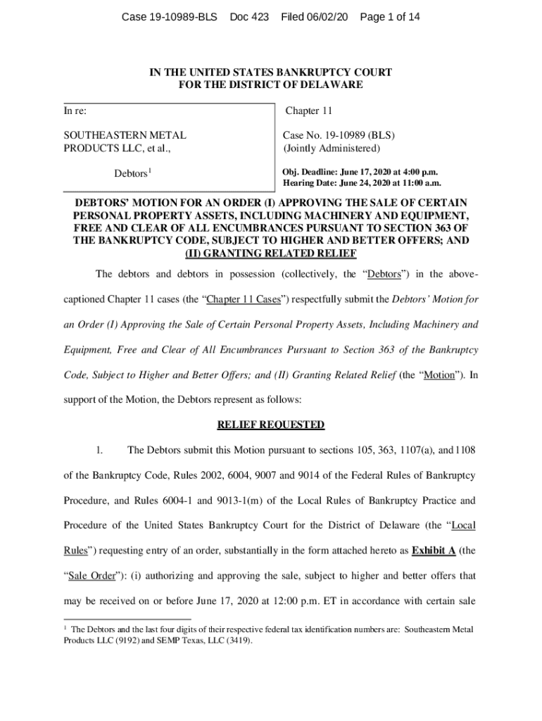 Case 1910989BLSDoc 423Filed 06/02/20Page 1 of 14IN THE UNITED STATES BANKRUPTCY COURT FOR THE DISTRICT OF DELAWARE In re:Chapter 11SOUTHEASTERN METAL PRODUCTS LLC, et al., Case No. 1910989 (BLS) (Jointly