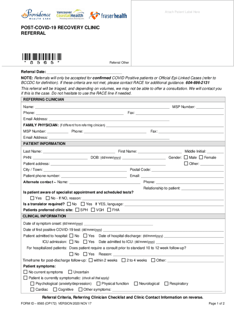 Clear FormPrintAttach Patient Label HerePOSTCOVID19 RECOVERY CLINIC REFERRALReferral OtherReferral Date: NOTE: Referrals will only be accepted for confirmed COVID-19 Positive patients or Official