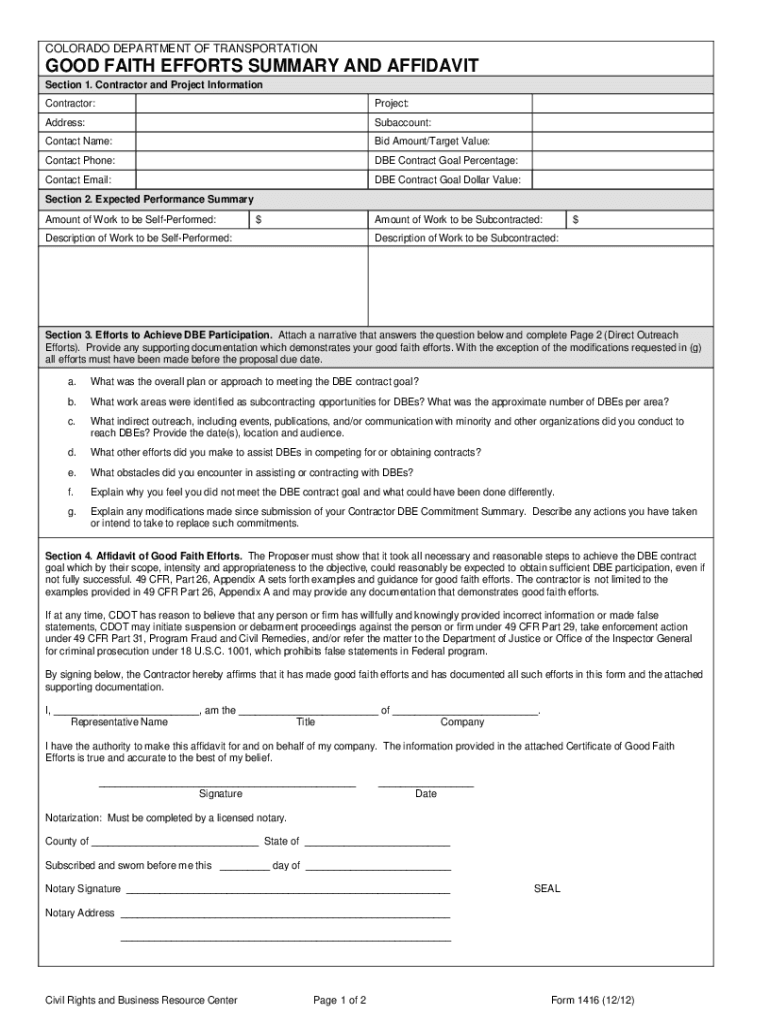 COLORADO DEPARTMENT OF TRANSPORTATIONGOOD FAITH EFFORTS SUMMARY AND AFFIDAVIT Section 1. Contractor and Project Information Contractor:Project:Address:Subaccount:Contact Name:Bid Amount/Target Value:Contact