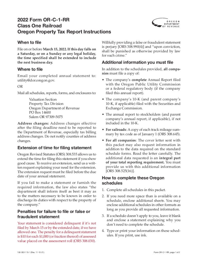 2022 Form ORC1RR Class One Railroad Oregon Property Tax Report Instructions When to file on or before March 15, 2022. If this day falls on a Saturday, or on a Sunday or any legal holiday, the time
