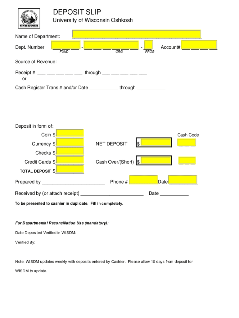 DEPOSIT SLIP University of Wisconsin Oshkosh Name of Department: Dept. Number FUNDORGAccount# Resource of Revenue: Receipt # through or Cash Register Trans # and/or Date through Deposit in form of: