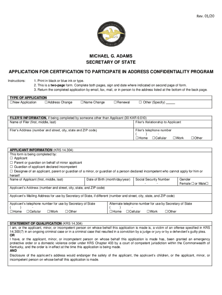 Rev. 01/20MICHAEL G. ADAMS SECRETARY OF STATE APPLICATION FOR CERTIFICATION TO PARTICIPATE IN ADDRESS CONFIDENTIALITY PROGRAM Instructions:1. Print in black or blue ink or type. 2. This is a two-page