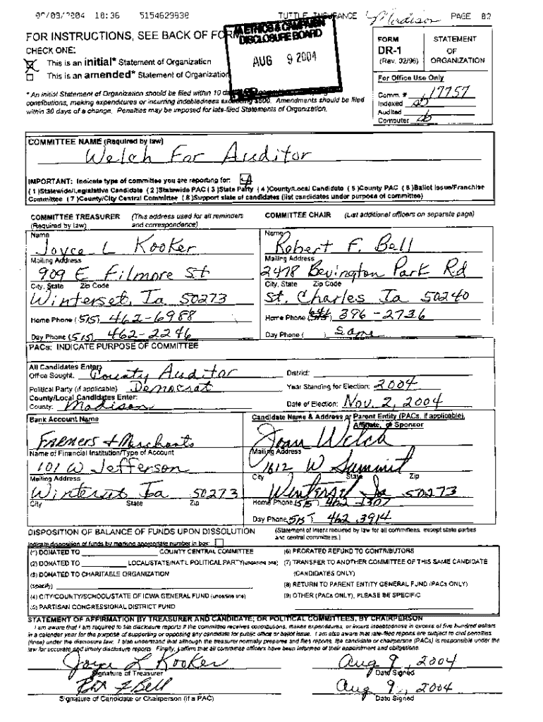 0 '/ 09l '00410 :355154629836FOR INSTRUCTIONS, SEE BACK OF FFORMinitial Statement of Organization This is an amended Statement of OrganizatiopIDR1CHECK ONE: This is a(Rev. 02196)STATEMENT OF Organization