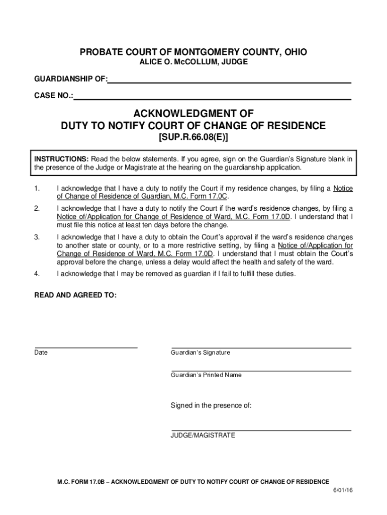 PROBATE COURT OF MONTGOMERY COUNTY, OHIO ALICE O. McCollum, JUDGE GUARDIANSHIP OF: CASE NO.:ACKNOWLEDGMENT OF DUTY TO NOTIFY COURT OF CHANGE OF RESIDENCE SUP. R.66.08(E) INSTRUCTIONS: Read the below