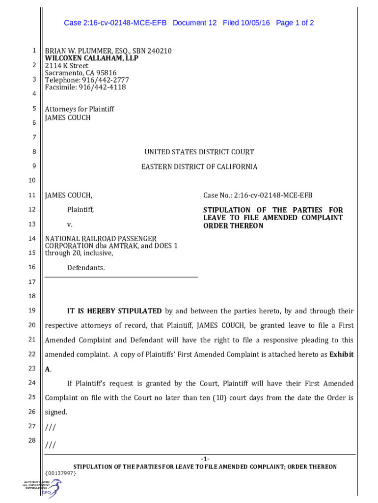 Case 2:16cv02148MCEEFB Document 12 Filed 10/05/16-Page 1 of 21 2 3 4 5 6 7 8BRIAN W. PLUMMER, ESQ., SON 240210WILCOXEN CALLAHAN, LLP2114 K Street Sacramento, CA 95816Telephone: 916/4422777Facsimile: