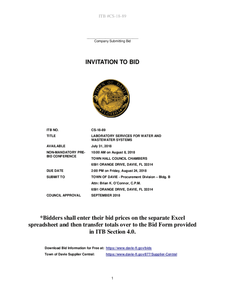 ITB #CS1889 Company Submitting Invitation TO BID ITB NO.CS1889TITLELABORATORY SERVICES FOR WATER AND WASTEWATER SYSTEMSAVAILABLEJuly 31, 2018NONMANDATORY PREBID CONFERENCE10:00 AM on August 8, 2018,