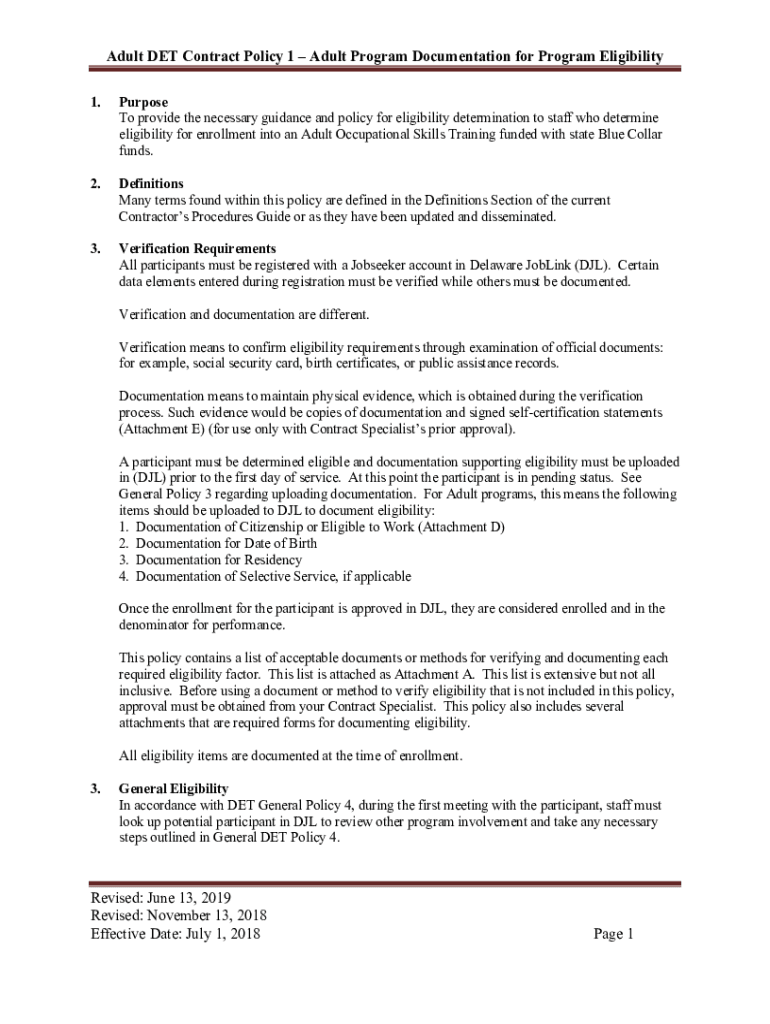Adult DET Contract Policy 1 Adult Program Documentation for Program Eligibility 1. Purpose To provide the necessary guidance and policy for eligibility determination to staff who determine eligibility