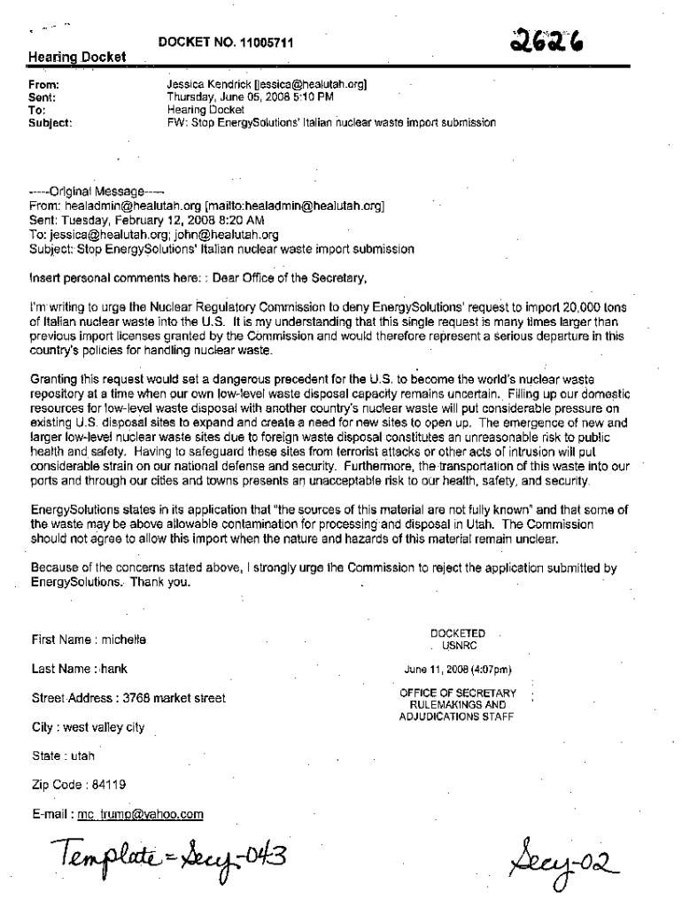 Get the free Comment (2626) of Michelle Hank Opposing EnergySolutions' Application to Import Nucl...