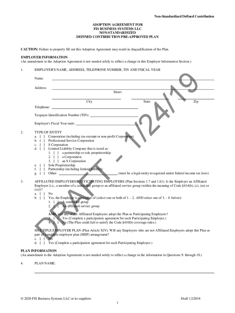 Unstandardized Defined Contribution ADOPTION AGREEMENT FOR IS BUSINESS SYSTEMS LLC UNSTANDARDIZED DEFINED CONTRIBUTION PREAPPROVED PLANTATION: Failure to properly fill out this Adoption Agreement