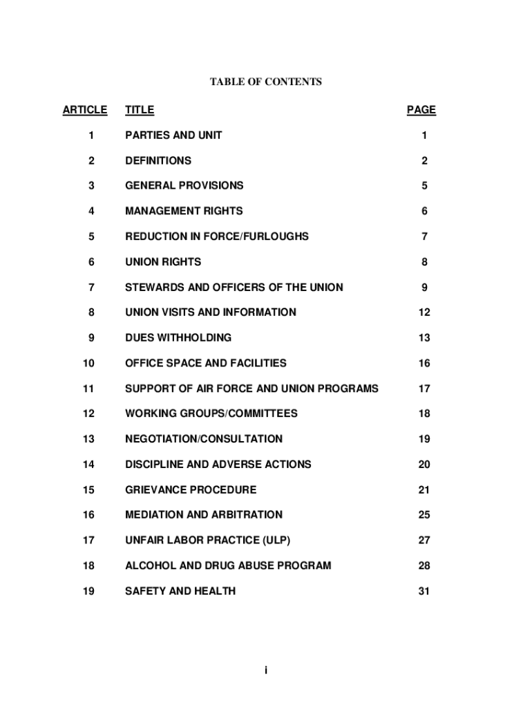 TABLE OF CONTENTS ARTICLETITLEPAGE1PARTIES AND UNIT12DEFINITIONS23GENERAL PROVISIONS54MANAGEMENT RIGHTS65REDUCTION IN FORCE/FURLOUGHS76UNION RIGHTS87STEWARDS AND OFFICERS OF THE UNION98UNION VISITS