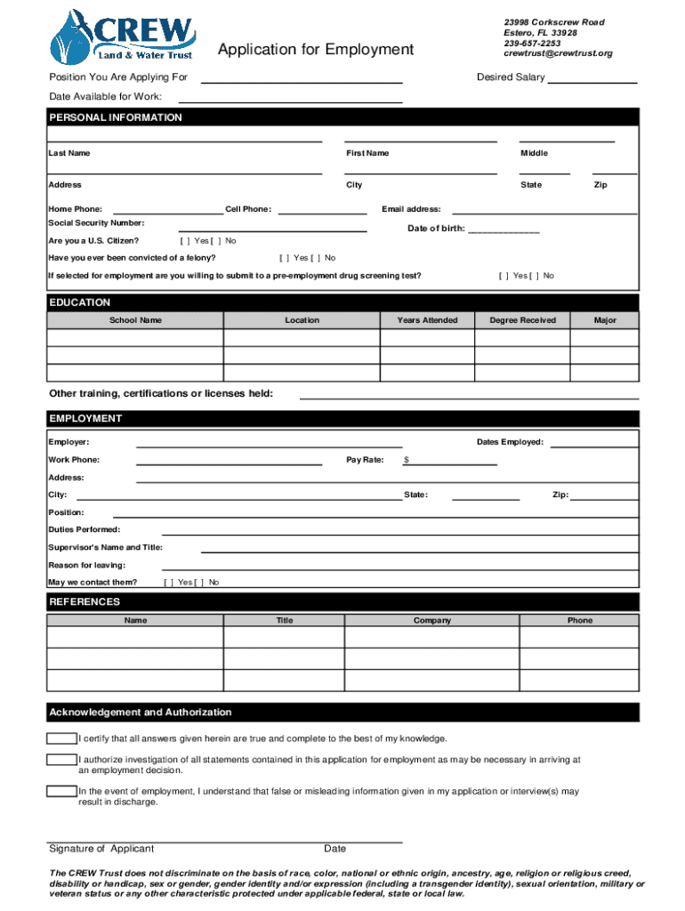 Application for Employment Position You Are Applying For23998 Corkscrew Road Ester, FL 33928 2396572253 crew trust. Ordered Salicylate Available for Work: PERSONAL Informational NameFirst NameMiddleAddressCityStateHome