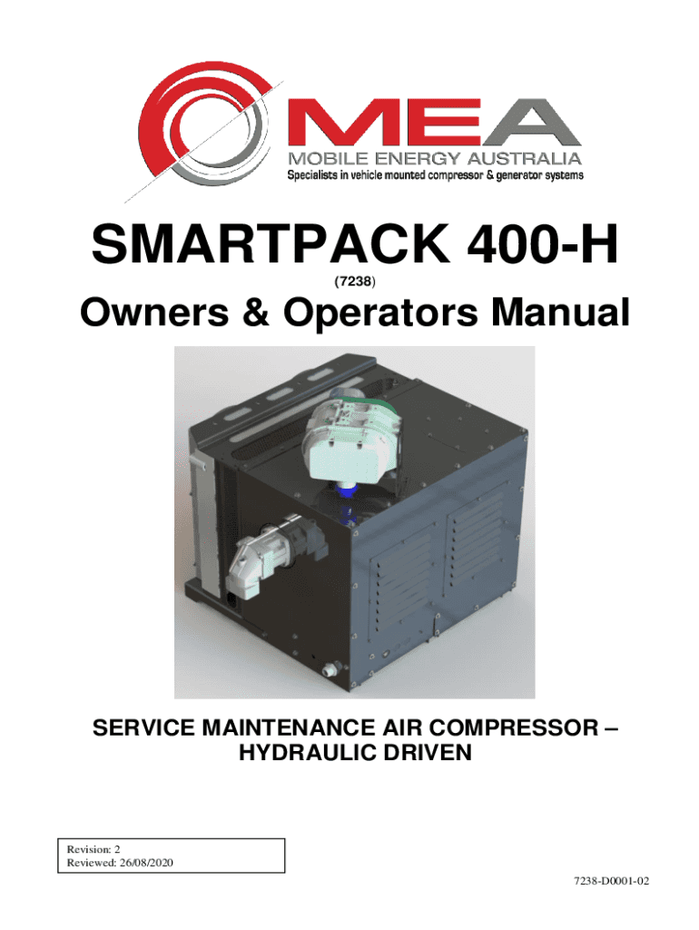 SMARTWATCH 400H (7238)Owners & Operators ManualSERVICE MAINTENANCE AIR COMPRESSOR HYDRAULIC DRIVENRevision: 2 Reviewed: 26/08/2020 7238D000102THIS PAGE WAS LEFT BLANK INTENTIONALLY. Document No 7238D0001022MEA