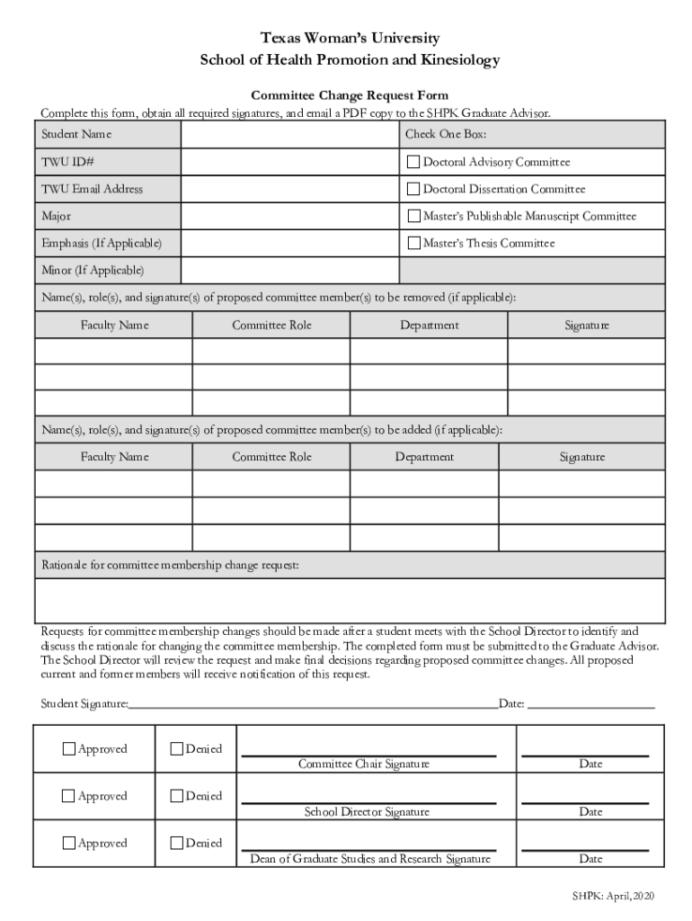 Texas Women University School of Health Promotion and Kinesiology Committee Change Request FormComplete this form, obtain all required signatures, and email a PDF copy to the SHK Graduate Advisor.