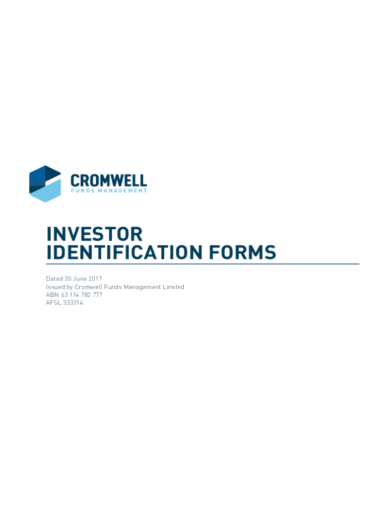 FUNDS MANAGEMENTINVESTOR IDENTIFICATION FORMS Dated 30 June 2017 Issued by Cromwell Funds Management Limited ABN 63 114 782 777 ADSL 333214INVESTOR IDENTIFICATION FORMS In 2006 the Federal Government