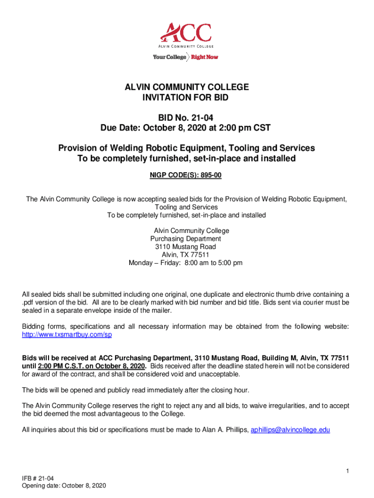 ALVIN COMMUNITY COLLEGE INVITATION FOR BID No. 2104 Due Date: October 8, 2020, at 2:00 pm CST Provision of Welding Robotic Equipment, Tooling and Services To be completely furnished, tinplate and