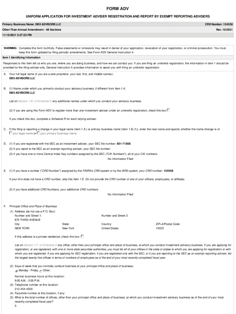FORM ADV UNIFORM APPLICATION FOR INVESTMENT ADVISER REGISTRATION AND REPORT BY EXEMPT REPORTING ADVISERS Primary Business Name: dB Advisers LLC CRD Number: 154558OtherThanAnnual Amendment All Sections