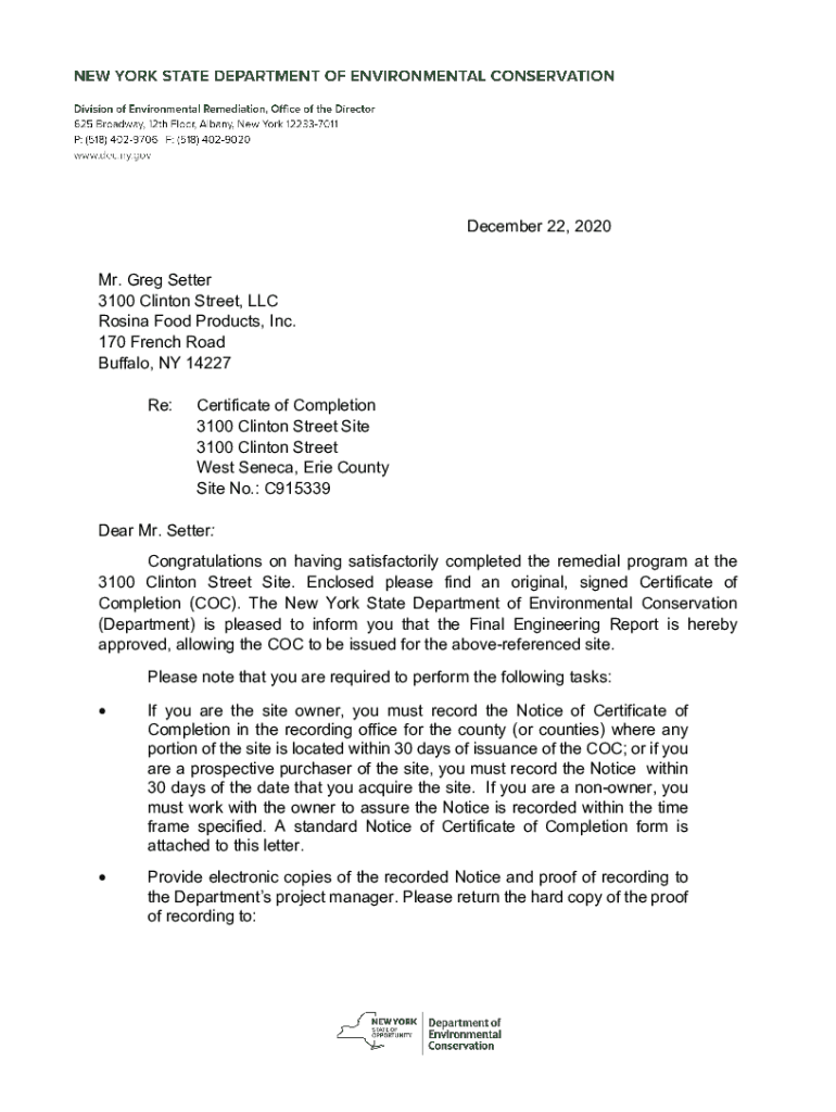 December 22, 2020, Mr. Greg Setter 3100 Clinton Street, LLC Rosin Food Products, Inc. 170 French Road Buffalo, NY 14227 Re:Certificate of Completion 3100 Clinton Street Site 3100 Clinton Street West