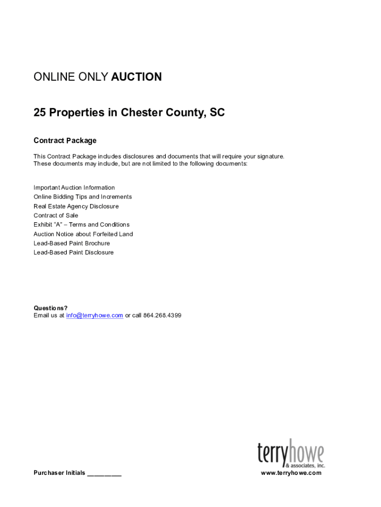ONLINE ONLY AUCTION 25 Properties in Chester County, SC Contract Package This Contract Package includes disclosures and documents that will require your signature. These documents may include, but