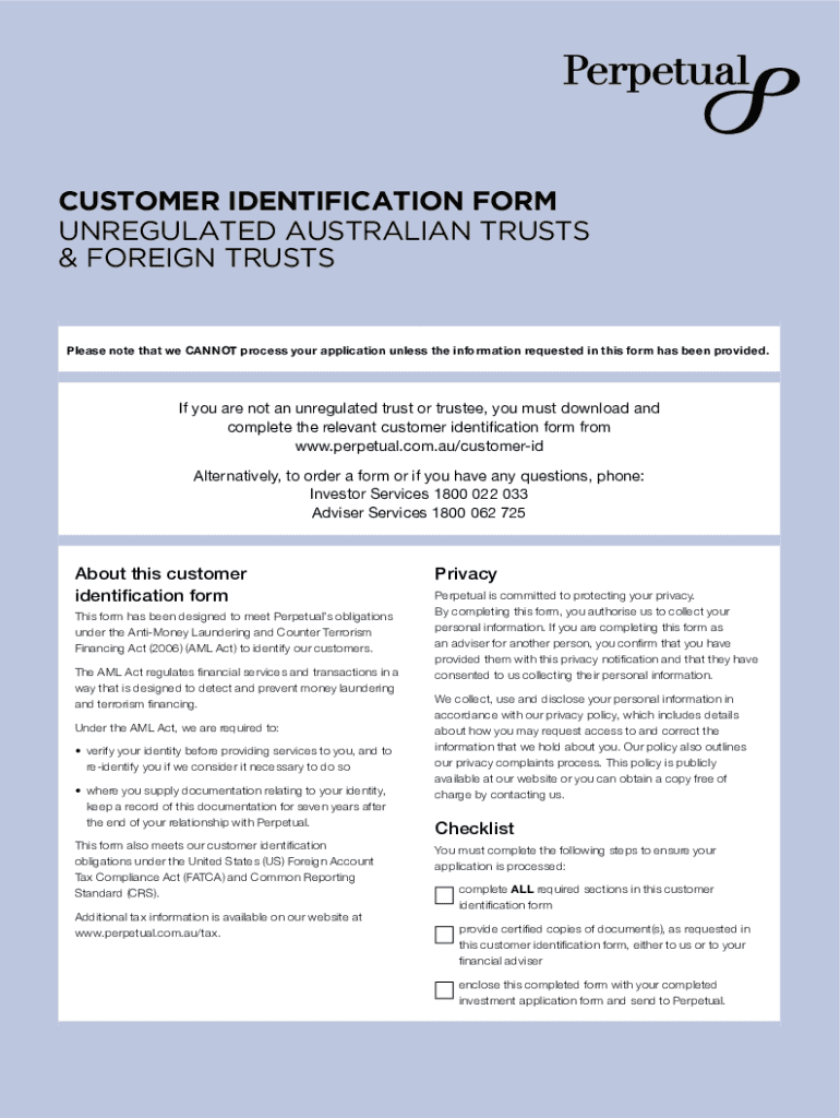 CUSTOMER IDENTIFICATION FORM UNREGULATED AUSTRALIAN TRUSTS & FOREIGN TRUSTSPlease note that we CANNOT process your application unless the information requested in this form has been provided. If you