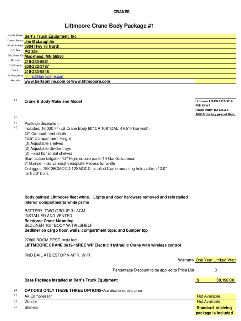 CRANESLiftmoore Crane Body Package #1 Vendor Name:Bert's Truck Equipment, Inc Jim McLaughlin Street Address: 3804 Hwy 75 North P.O. Box: PO 336 City, State, Zip Muirhead, MN 56560 Phone #: 2182338681