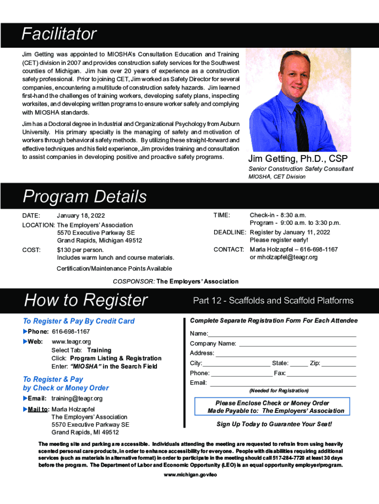 An Informative Full day Seminar:Part 12 Scaffolds and Scaffold Platforms1Who Should Attend. . .2MIOSHA Training Institute3What You'll Learn. . . This seminar is a must for anyone concerned about health
