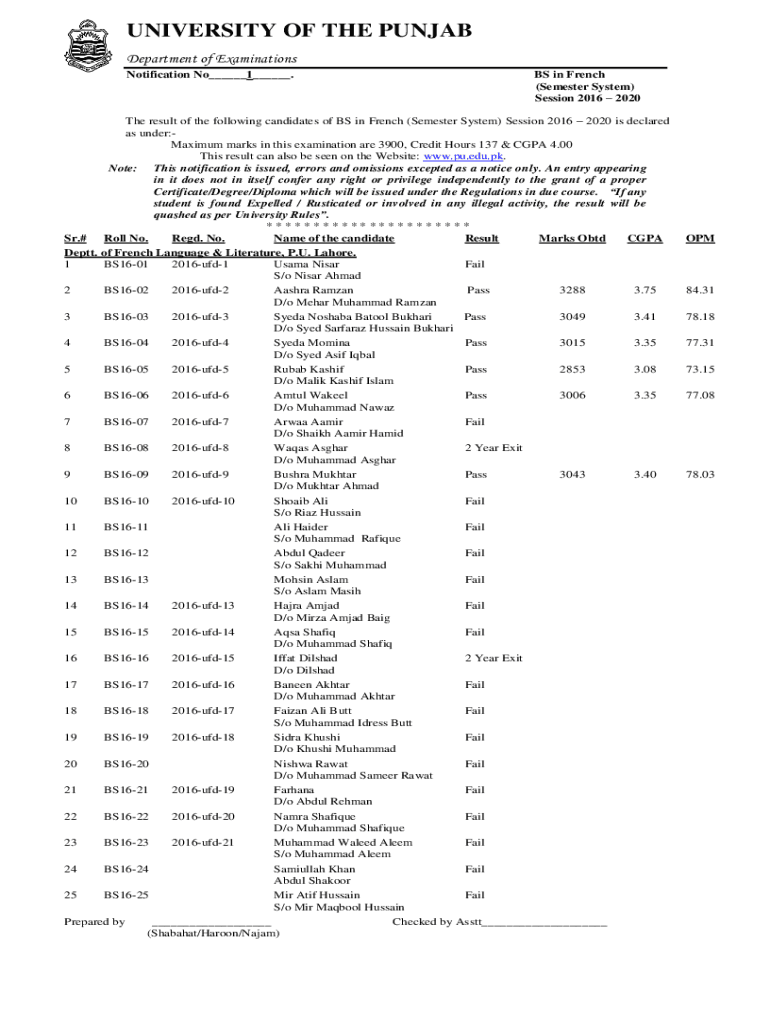 UNIVERSITY OF THE PUNJAB Department of Examinations Notification No___1___.BS in French (Semester System) Session 2016 2020The result of the following candidates of BS in French (Semester System)