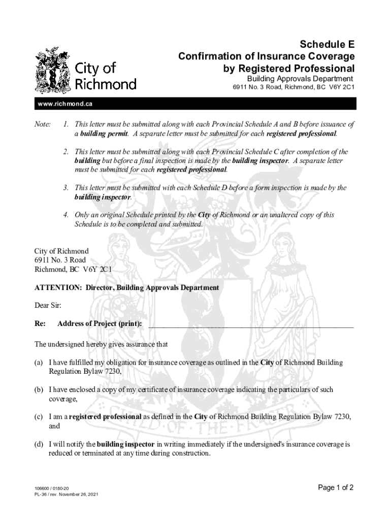 Schedule E Confirmation of Insurance Coverage by Registered Professional Building Approvals Department 6911 No. 3 Road, Richmond, BC V6Y 2C1 www.richmond.caNote:1. This letter must be submitted along