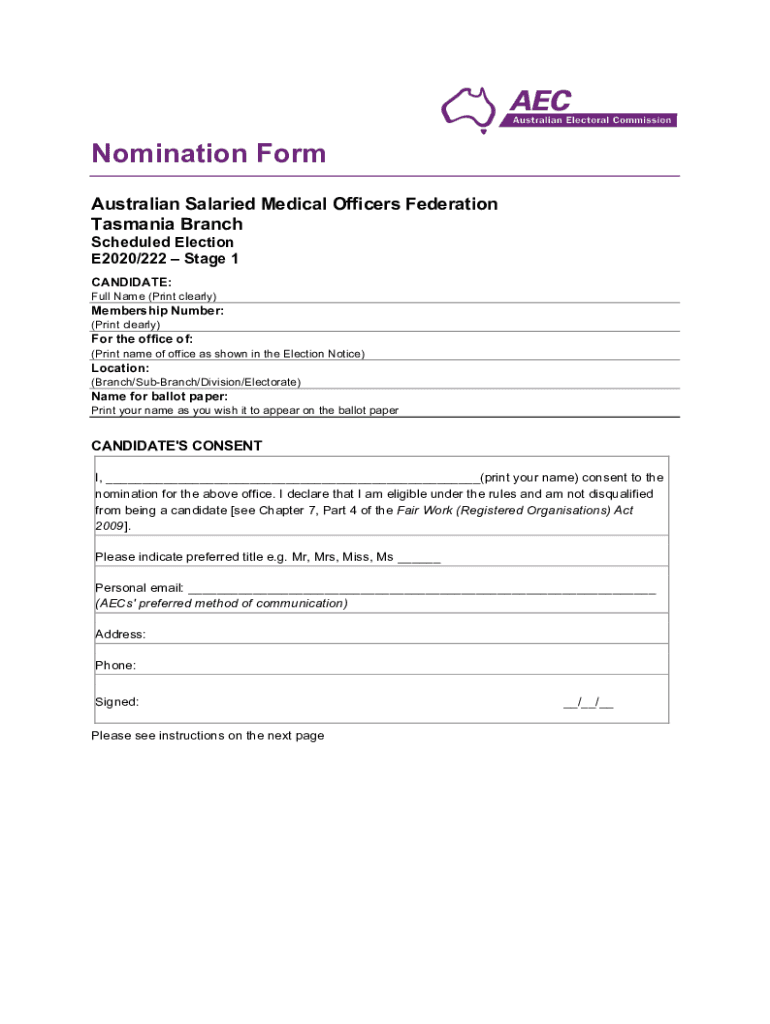 Nomination Form Australian Salaried Medical Officers Federation Tasmania Branch Scheduled Election E2020/222 Stage 1 CANDIDATE:Full Name (Print clearly)Membership Number: (Print clearly)For the office