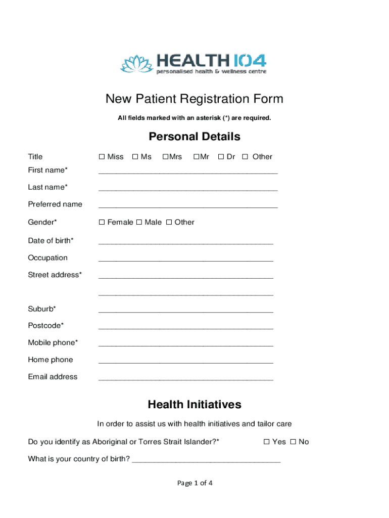 New Patient Registration Form All fields marked with an asterisk (*) are required. Personal Details Title Miss MSMEs Dr Otherwise name* Last name* Preferred name Gender* Female Male Operate of birth*
