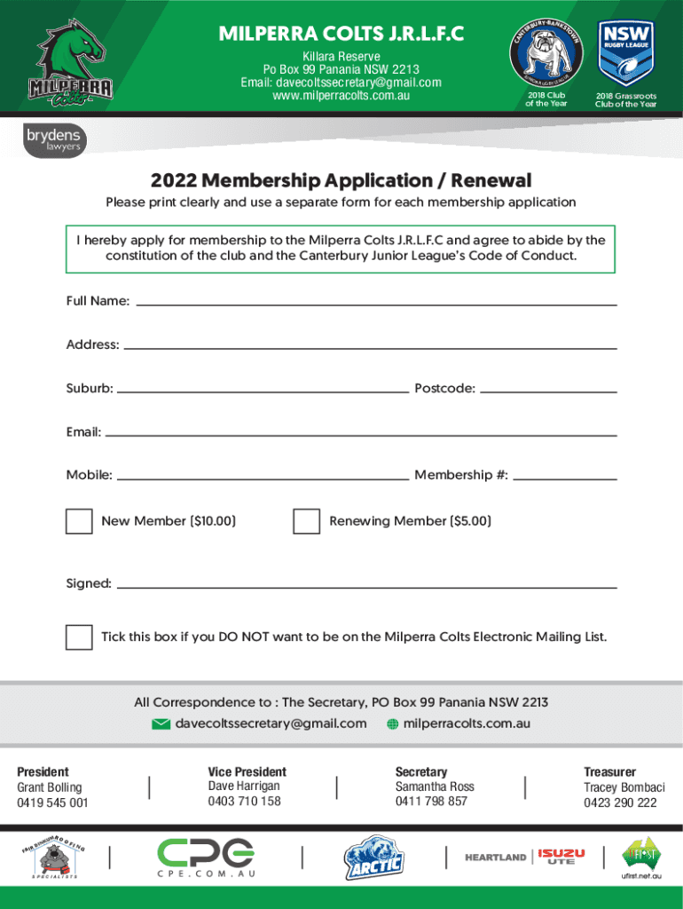 Killer Reserve Po Box 99 Panama NSW 2213 Email: davecoltssecretary@gmail.com www.milperracolts.com.auCA NOUN W OMILPERRA COLTS J.R.L.F.BANK BUR ST PRIOR U G B Y LEAGUE2018 Club of the Year2018 Grassroots