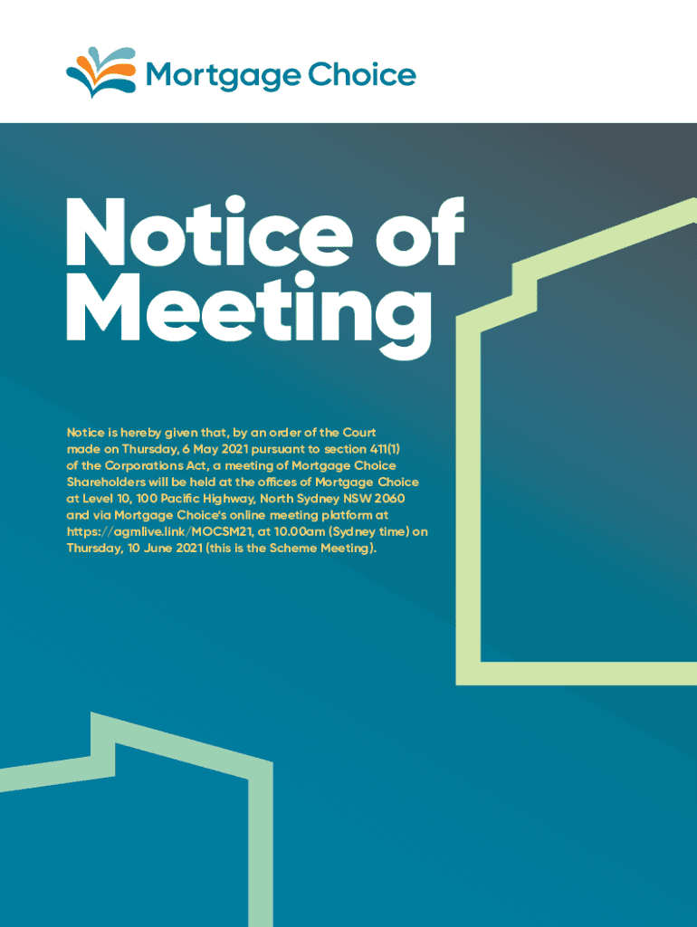 Notice of Meeting Notice is hereby given that, by an order of the Court made on Thursday, 6 May 2021 pursuant to section411(1) of the Corporations Act, a meeting of MortgageChoice Shareholders will