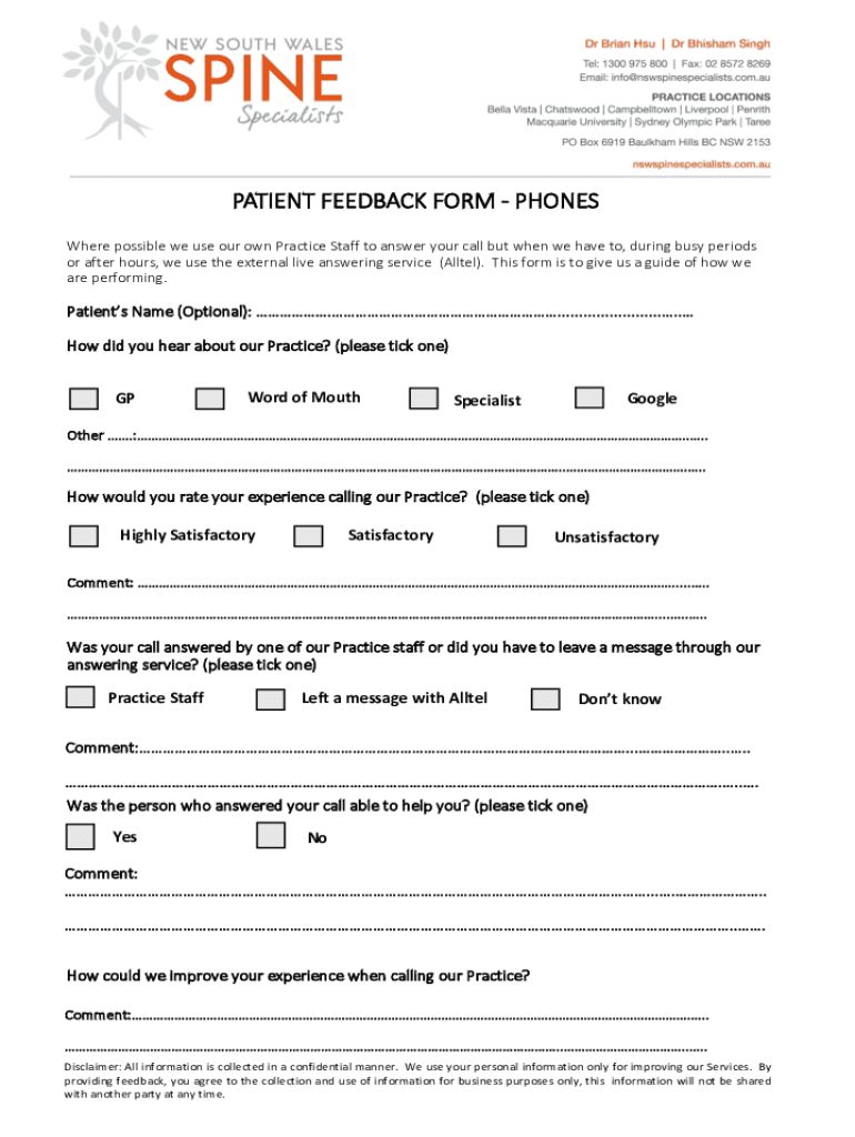 Get the free NSWSS Patient Feedback Form - Phones