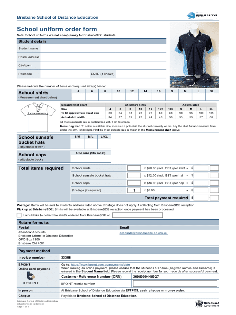 Brisbane School of Distance EducationSchool uniform order footnote: School uniforms are not compulsory for Brisbane students. Student details Student name Postal address City/town Postcode ID (if