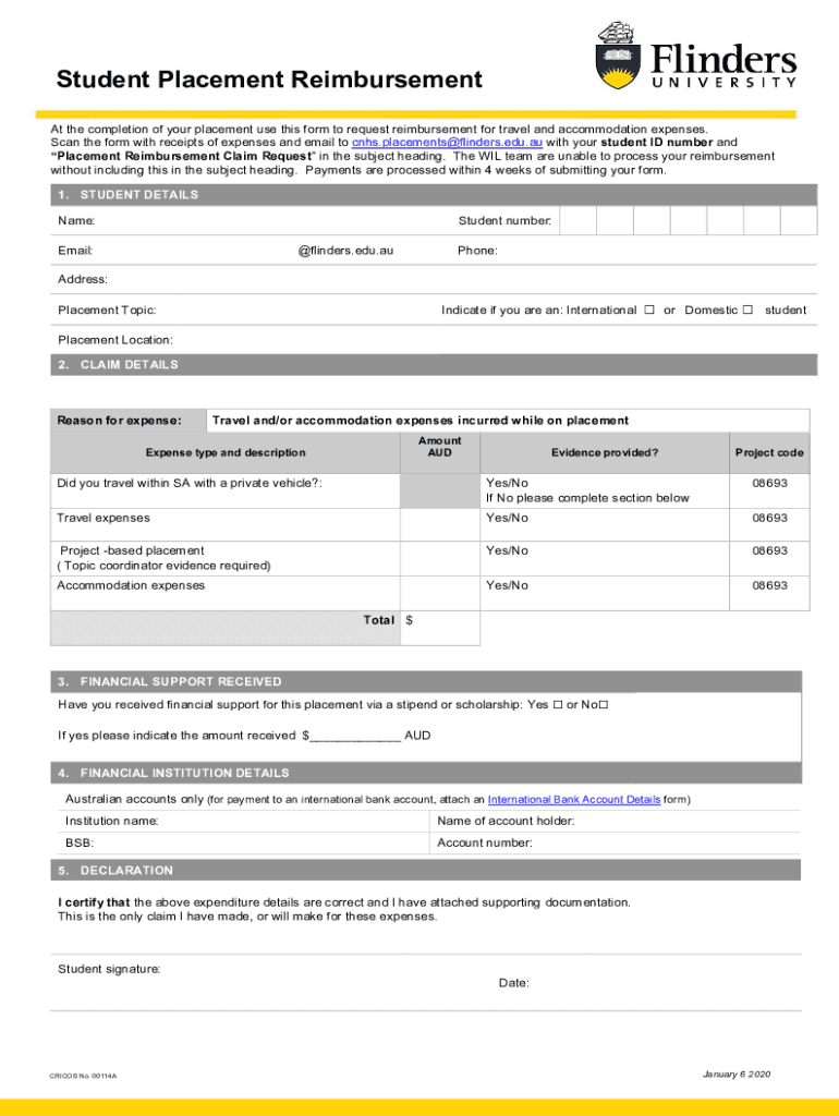 Student Placement Reimbursement At the completion of your placement use this form to request reimbursement for travel and accommodation expenses. Scan the form with receipts of expenses and email