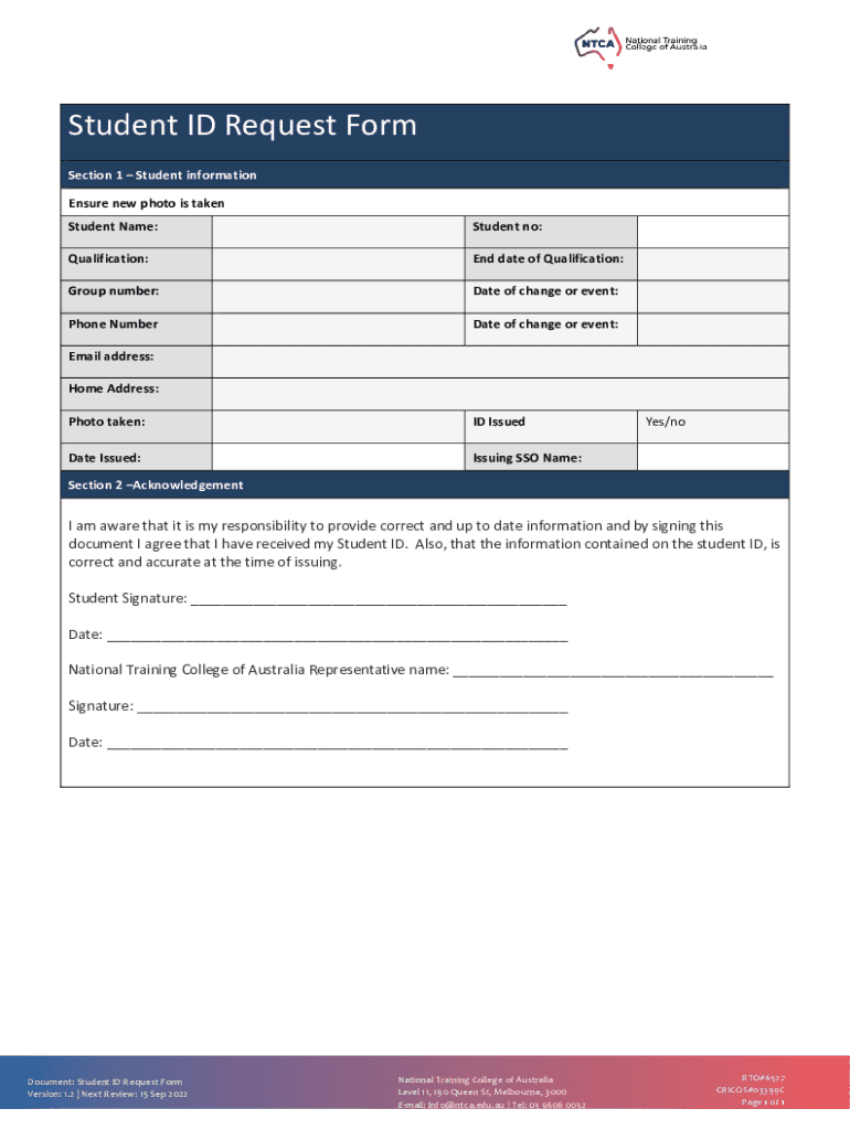 Student ID Request Form Section 1 Student information Ensure new photo is taken Student Name:Student no:Qualification:End date of Qualification:Group number:Date of change or event:Phone Numerate