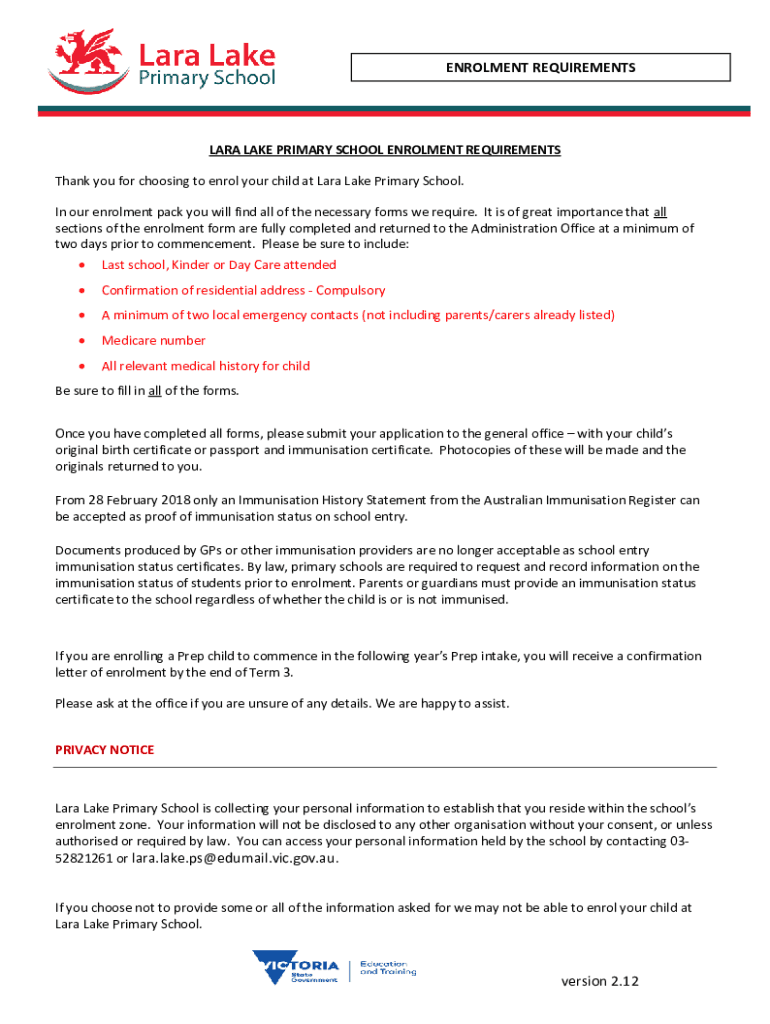 Enrollment REQUIREMENTSLARA LAKE PRIMARY SCHOOL Enrollment REQUIREMENTS Thank you for choosing to enrol your child at Lara Lake Primary School. In our enrollment pack you will find all the necessary