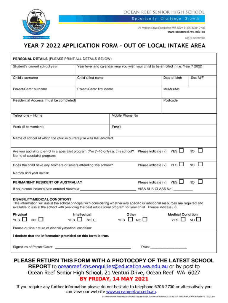 Get the free YEAR 7 2022 APPLICATION FORM - OUT OF LOCAL INTAKE AREA