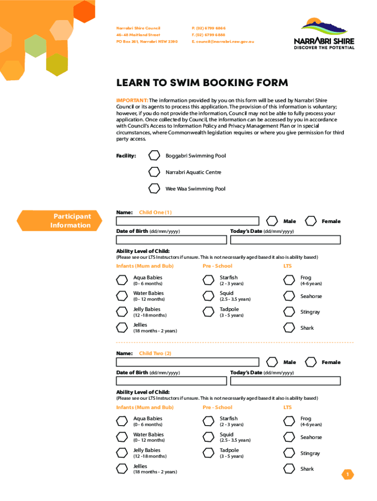 Narrator Shire Council. (02) 6799 68664648 Maitland Street. (02) 6799 6888PO Box 261, Narrator NSW 2390E. council@narrabri.nsw.gov.auLEARN TO SWIM BOOKING FORM IMPORTANT: The information provided