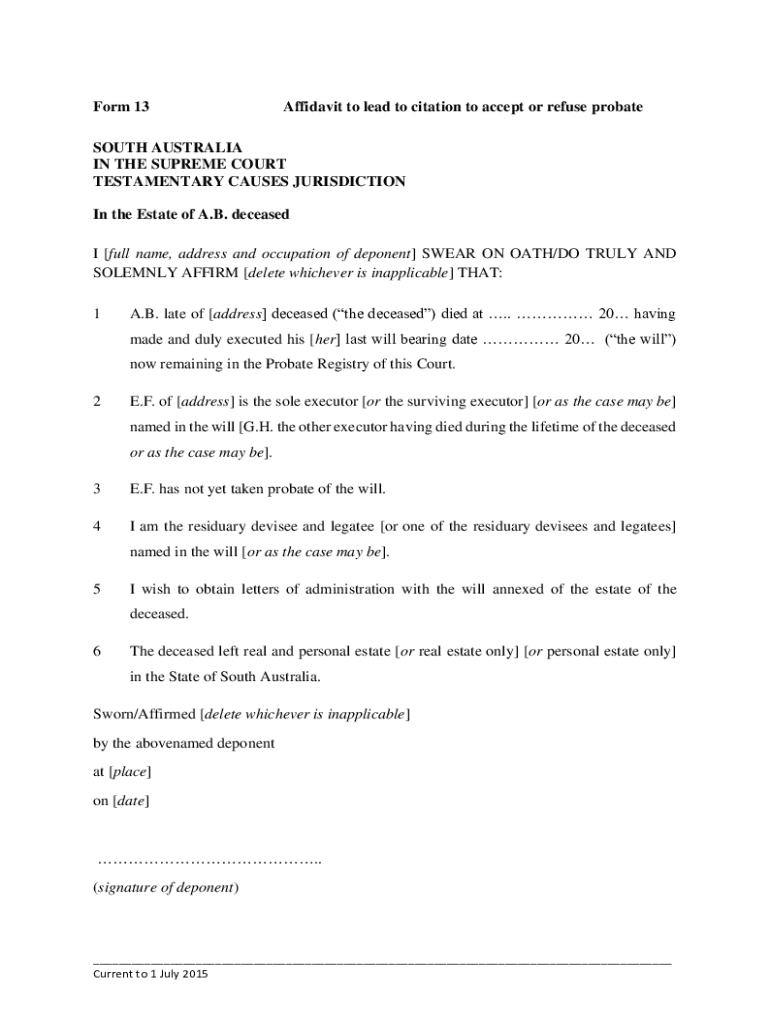Form 13Affidavit to lead to citation to accept or refuse probateSOUTH AUSTRALIA IN THE SUPREME COURT TESTAMENTARY CAUSES JURISDICTION In the Estate of A.B. deceased I full name, address and occupation