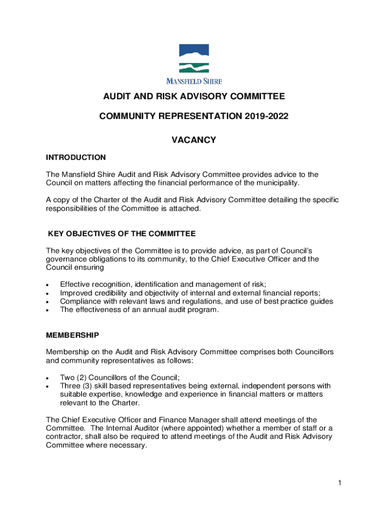 AUDIT AND RISK ADVISORY COMMITTEE COMMUNITY REPRESENTATION 20192022 VACANCY INTRODUCTION The Mansfield Shire Audit and Risk Advisory Committee provides advice to the Council on matters affecting the