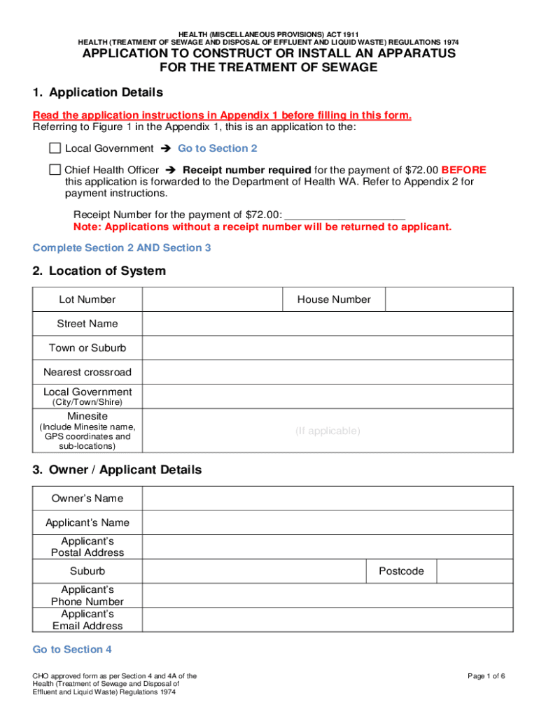HEALTH (MISCELLANEOUS PROVISIONS) ACT 1911 HEALTH (TREATMENT OF SEWAGE AND DISPOSAL OF EFFLUENT AND LIQUID WASTE) REGULATIONS 1974APPLICATION TO CONSTRUCT OR INSTALL AN APPARATUS FOR THE TREATMENT
