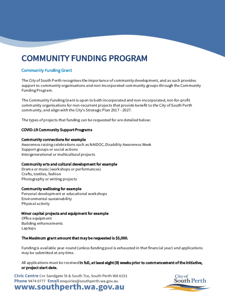 COMMUNITY FUNDING PROGRAM Community Funding Grant The City of South Perth recognizes the importance of community development, and as such provides support to community organizations and nonincorporated