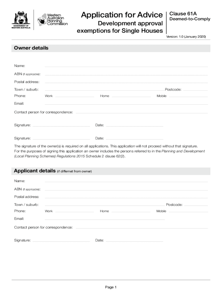 Application for AdviceClause 61ADeemedtoComplyDevelopment approval exemptions for Single Houseperson: 1.0 (January 2020)Owner detailsName:ABN (if applicable):Postal address:Town / suburb:Phone:Postcode:
