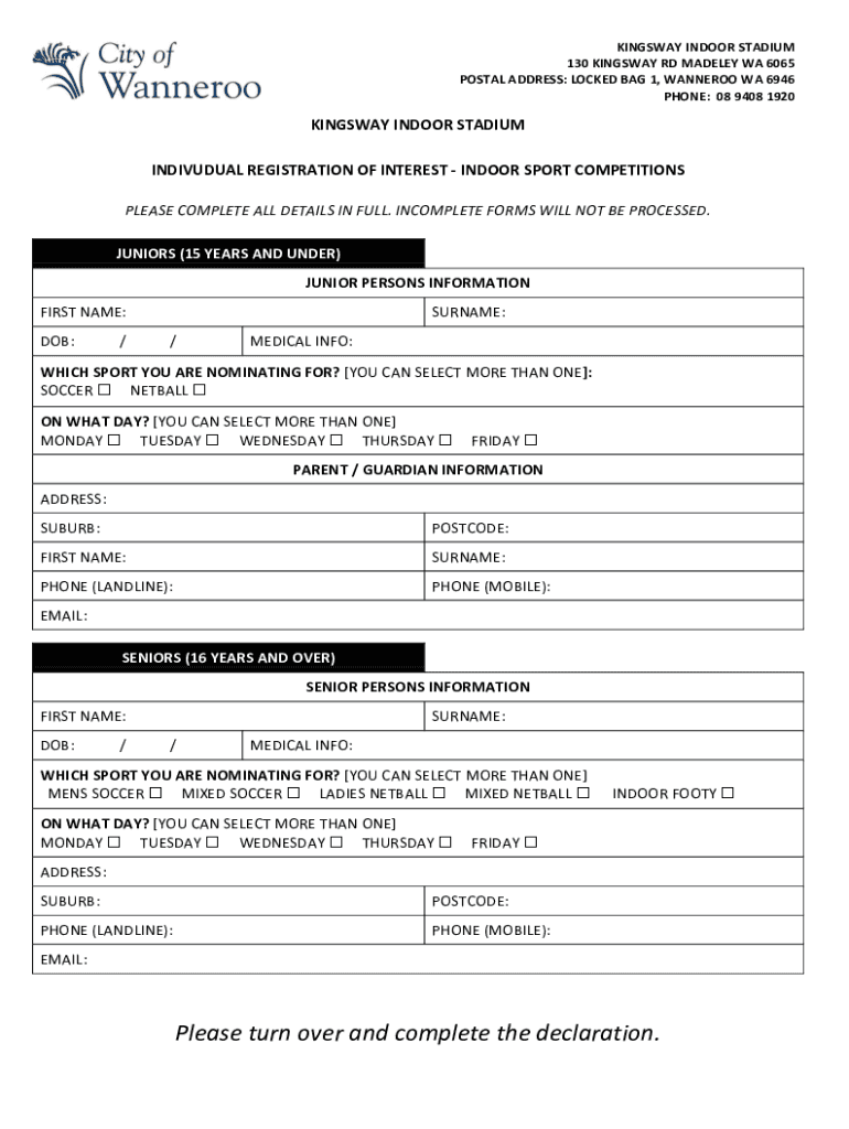 KINGSLEY INDOOR STADIUM 130 KINGSLEY RD MODELED WA 6065 POSTAL ADDRESS: LOCKED BAG 1, WANNEROO WA 6946 PHONE: 08 9408 1920KINGSWAY INDOOR STADIUM INDIVIDUAL REGISTRATION OF INTEREST INDOOR SPORT COMPETITIONS