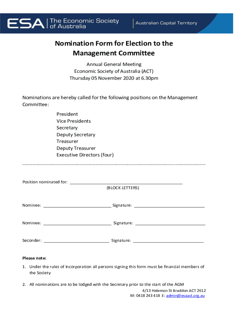 Nomination Form for Election to the Management Committee Annual General Meeting Economic Society of Australia (ACT) Thursday 05 November 2020 at 6.30pmNominations are hereby called for the following
