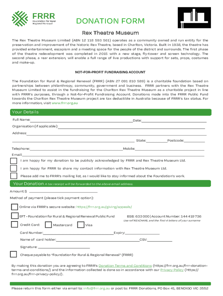 DONATION FORM Rex Theater Museum The Rex Theater Museum Limited (ABN 12 118 593 561) operates as a community owned and run entity for the preservation and improvement of the historic Rex Theater,