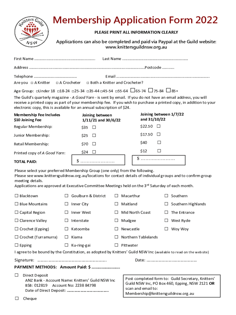 Membership Application Form 2022 PLEASE PRINT ALL INFORMATION CLEARLY Applications can also be completed and paid via PayPal at the Guild website: www.knittersguildnsw.org.au First Name .........