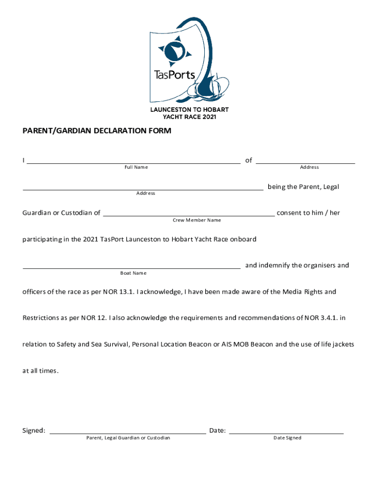PARENT/GUARDIAN DECLARATION FORM of Full Headdress being the Parent, Legal AddressGuardian or Custodian of consent to him / her Crew Member Name participating in the 2021 Sport Launceston to Hobart