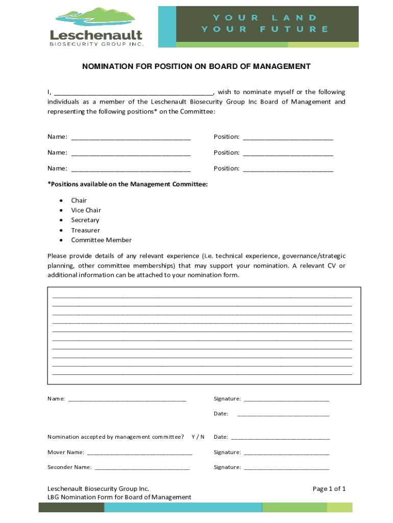 Get the free NOMINATION FOR POSITION ON BOARD OF MANAGEMENT