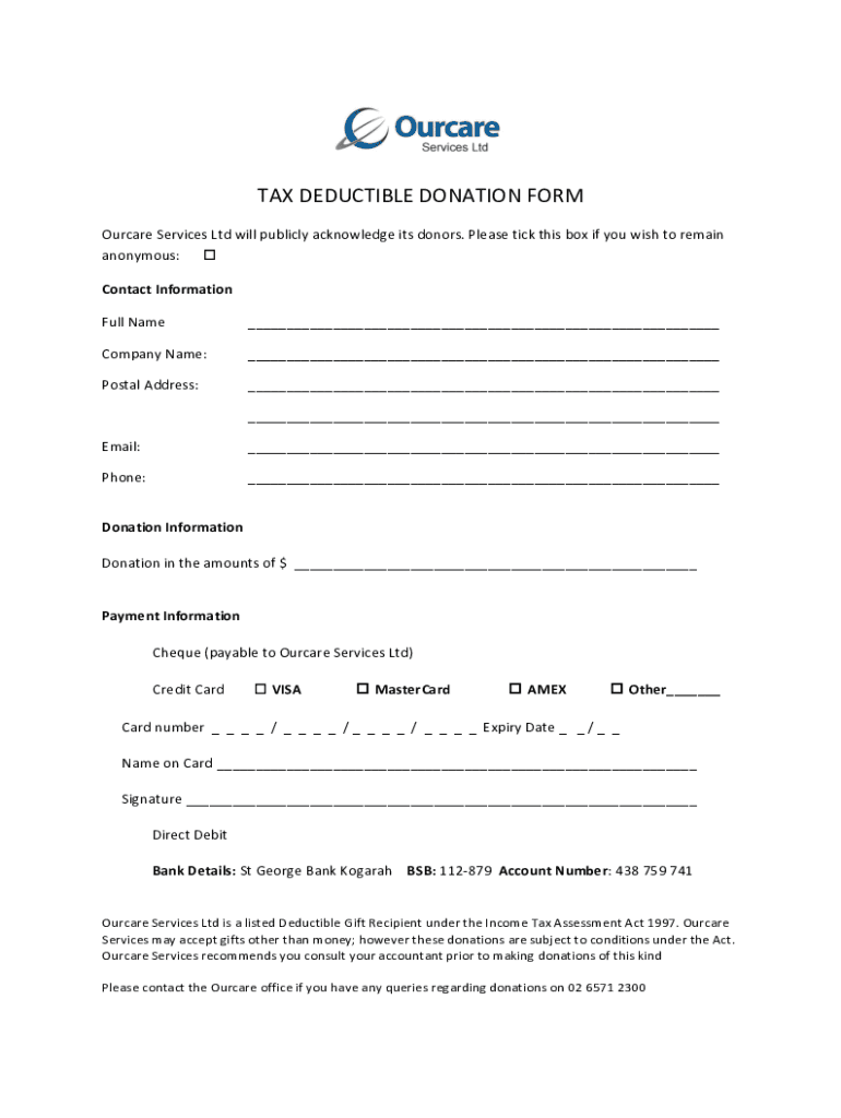 TAX DEDUCTIBLE DONATION FORMOurcare Services Ltd will publicly acknowledge its donors. Please tick this box if you wish to remain anonymous:contact Informational Name Company Name: Postal Address: